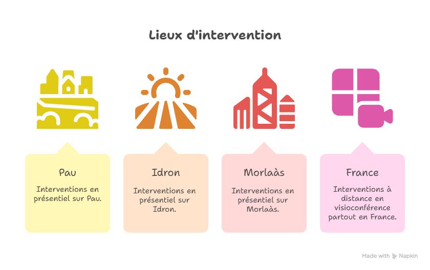 Nous proposons nos accompagnements dans différents lieux : Pau, Idron et Morlaàs, et nous offrons également la possibilité de suivre nos prestations à distance en visioconférence.